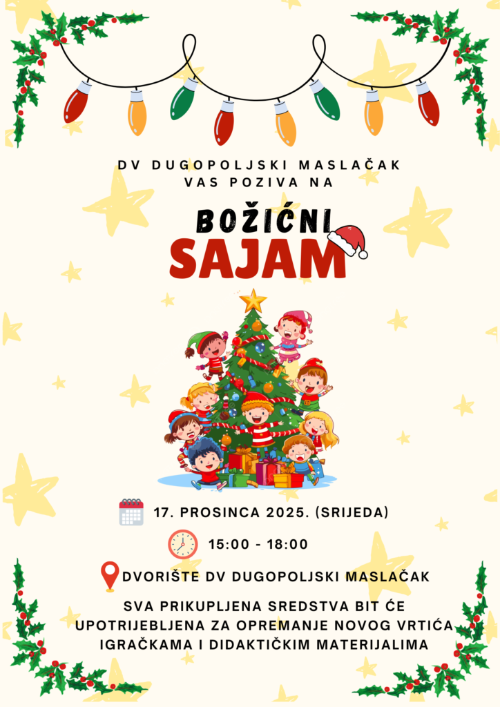 Posjetite nas 17. prosinca (srijeda) od 15 do 18 sati u dvorištu našeg vrtića na adresi 4. gardijske brigade 6 i kupite ručno rađene božićne ukrase, kolačiće ili fritule, zapjevajte s našom i vašom djecom najljepše božićne pjesme i uživajte u blagdanskoj atmosferi.